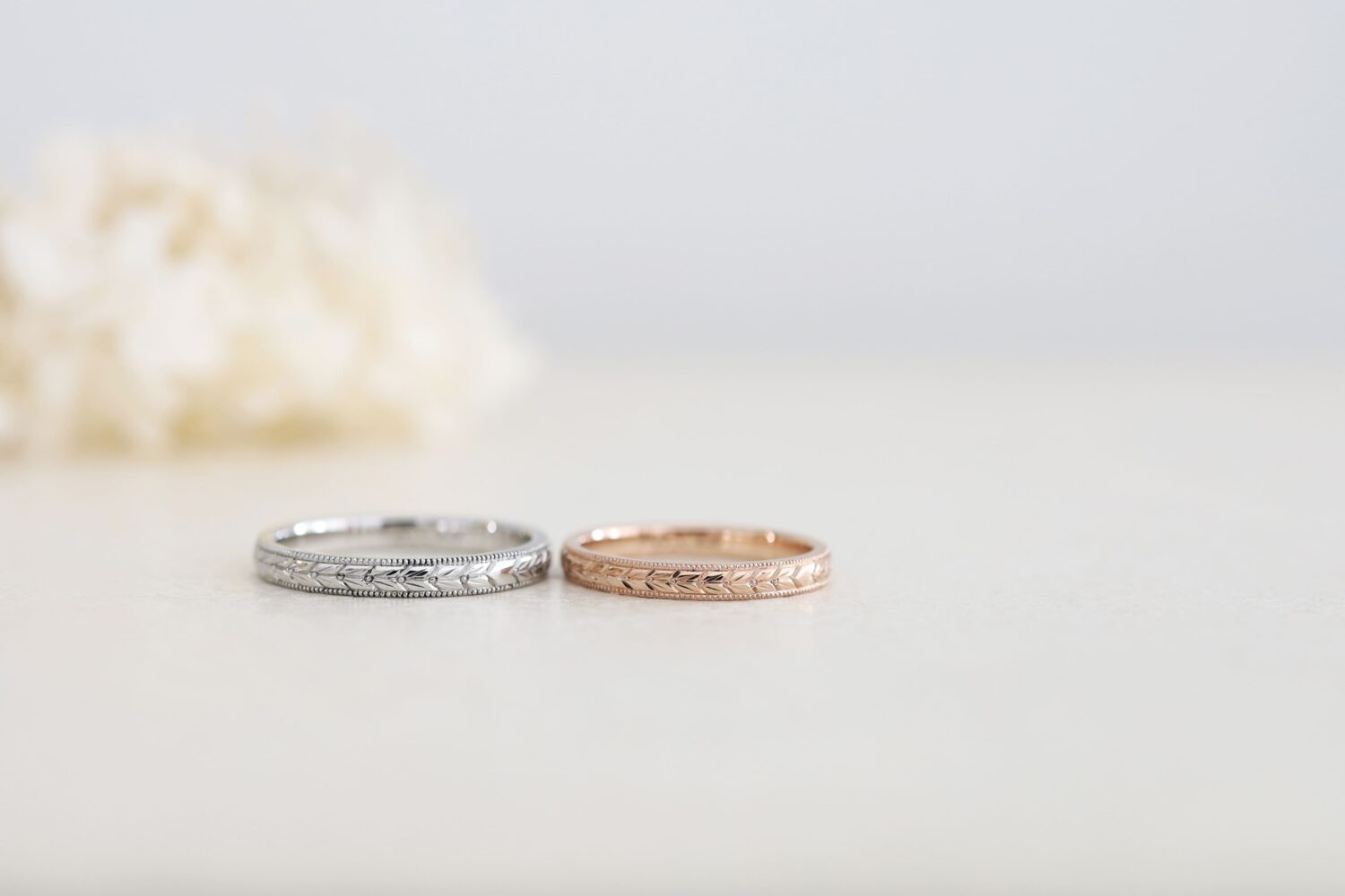 彫金の伝統技法 月桂樹彫りの結婚指輪です。