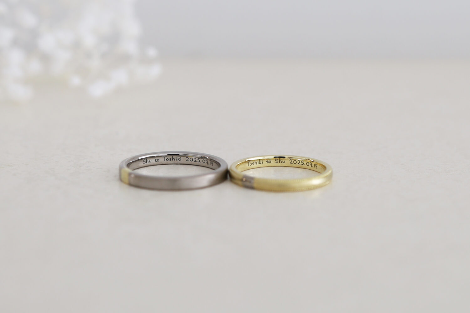 お二人のリングの刻印は、手書きの文字を・・ やわらかな文字に愛情を感じます。 レーザー刻印は、このようにお二人が書いた文字をデータにさせていただき 刻印することができますので、ご相談下さい。