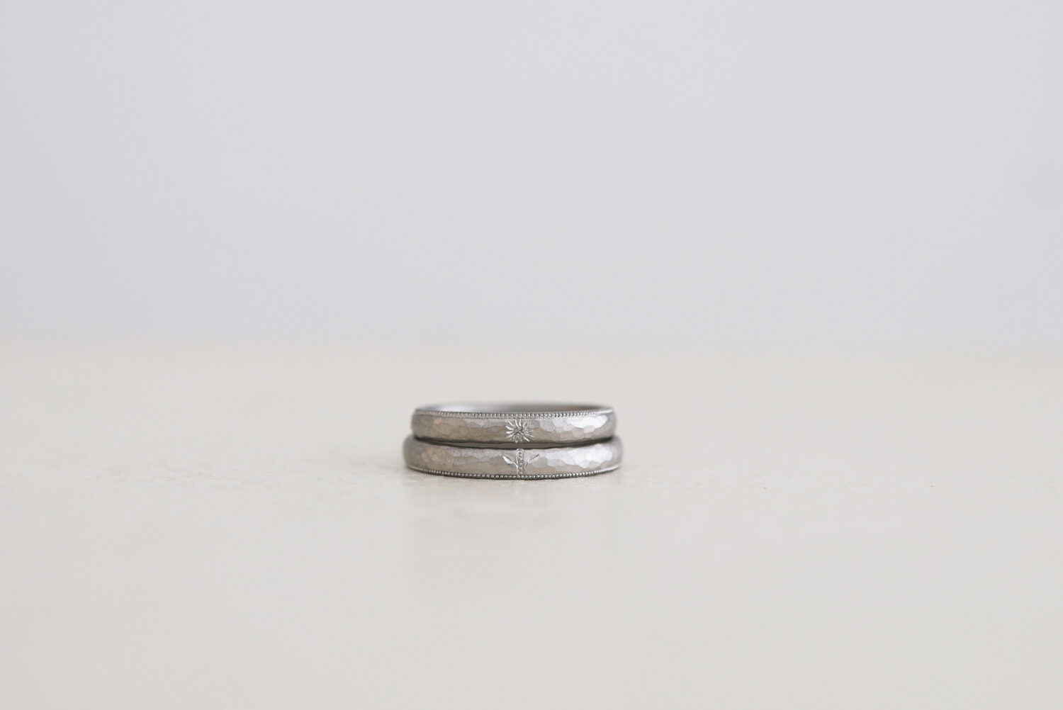 二人のリングに重なる、ひまわりの彫り模様