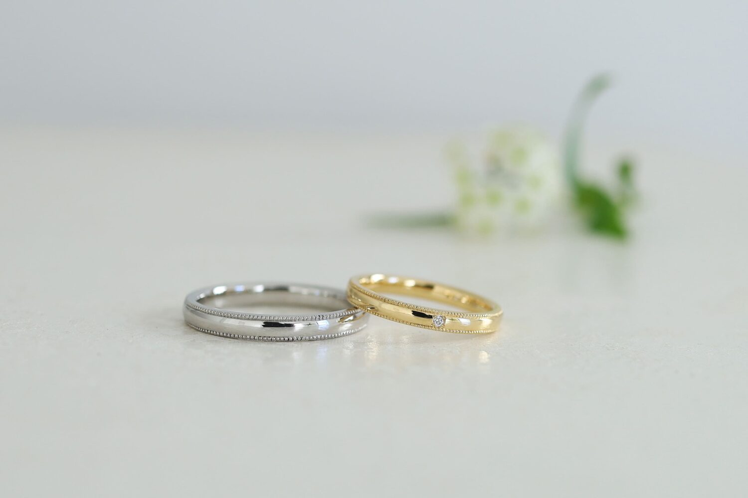 プラチナとイエローゴールドのシンプルなミルグレインリング