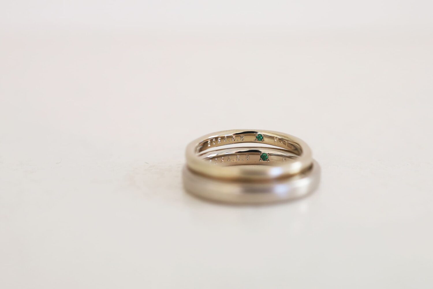 ブラシ仕上げK18WG & CG 内側にエメラルドのマリッジリング