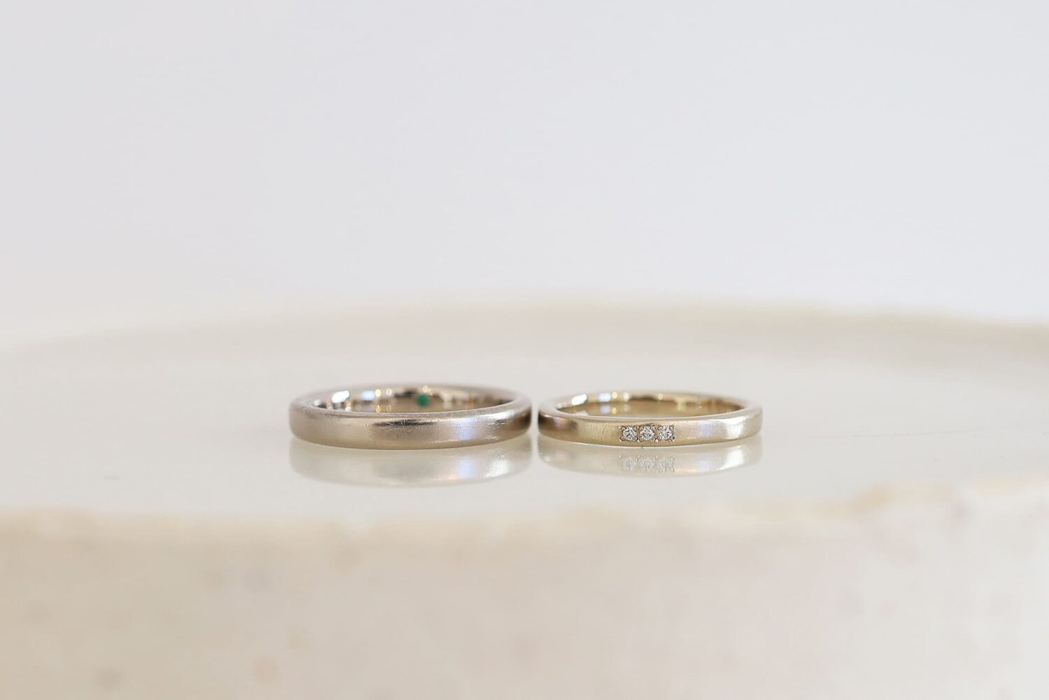 色違いのリングの質感をそろえてお作りした、素敵な結婚指輪です。