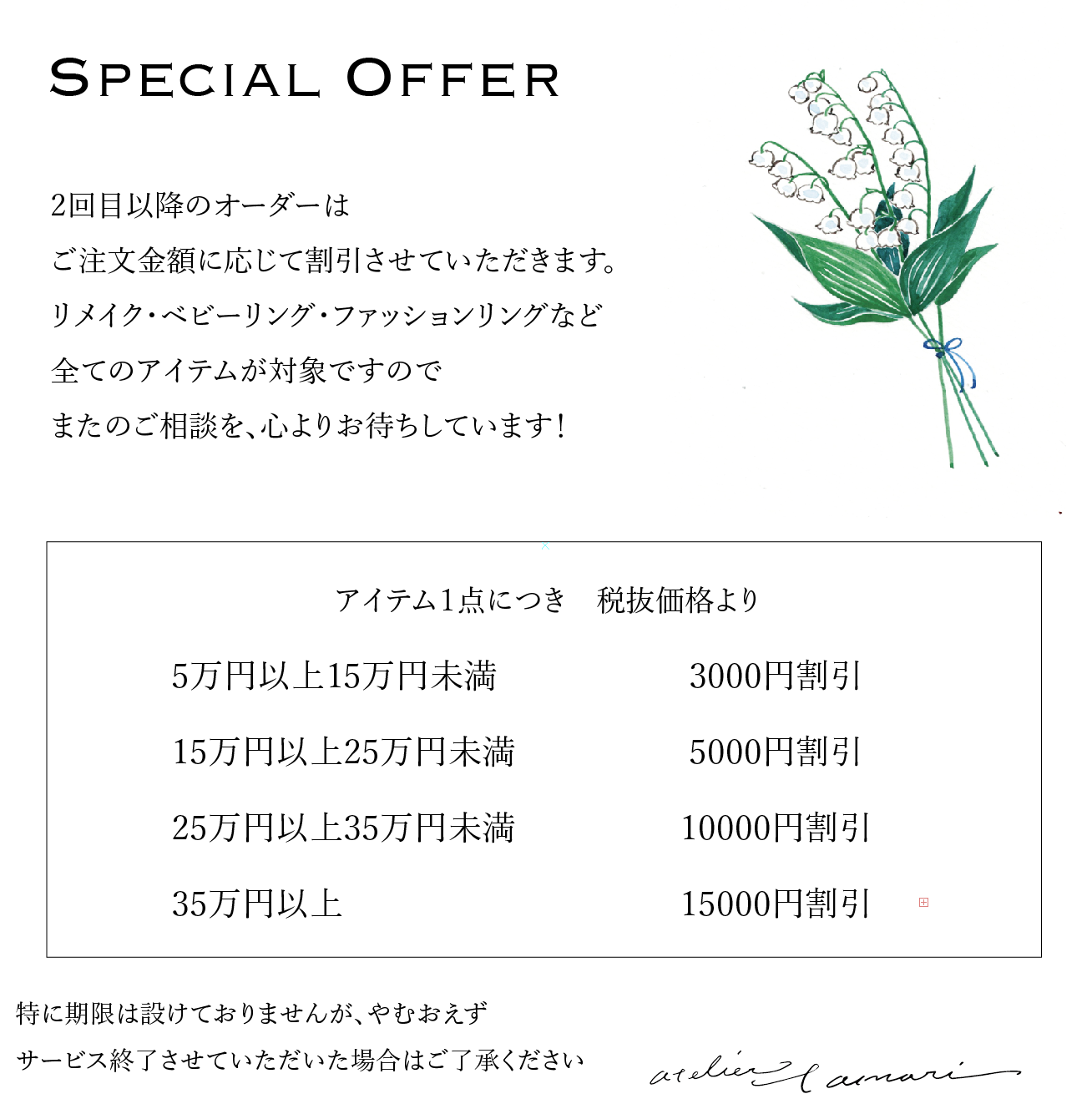 なお、セカンドマリッジサービス(リング引取りで20%オフ)・紛失された場合の同じデザイン作り直しサービス(今の価格から5%割引)は、リピート特典の対象外とさせていただきます。ご了承ください。※2026年3月時点のサービス内容です 詳しくはこちら